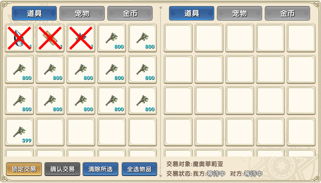 锁定交易: 自己的道具将展示在左侧,可多选道具。 点击“锁定交易”后,会将选中的道具 / 宠物 / 金币放入交易中。