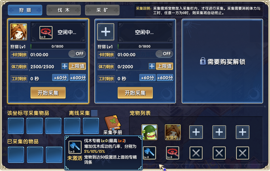 采集类型: 狩猎 / 伐木 / 采矿,三类采集方式均默认拥有 1 个采集栏位, 最多可拓展至 3 个栏位。